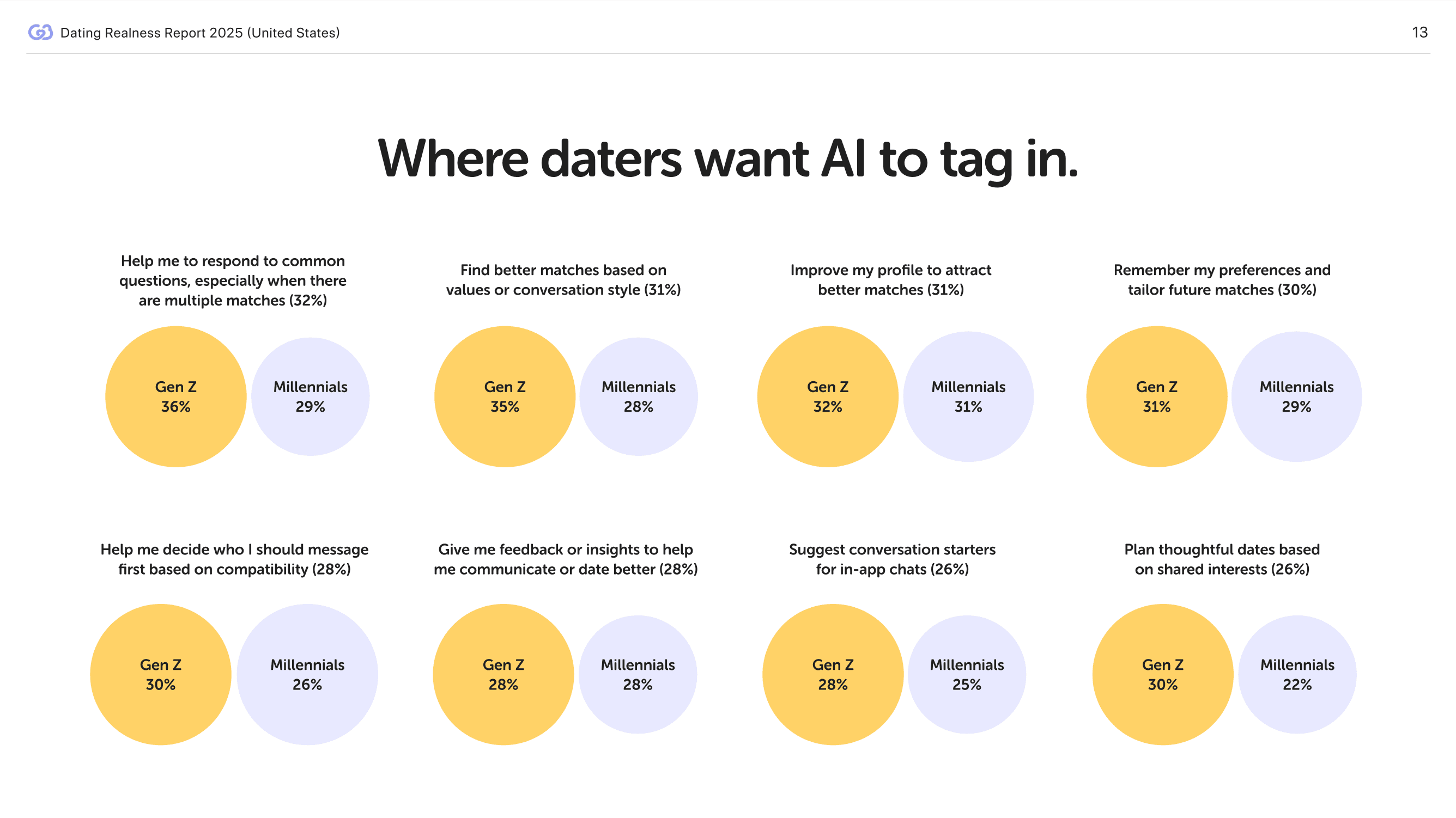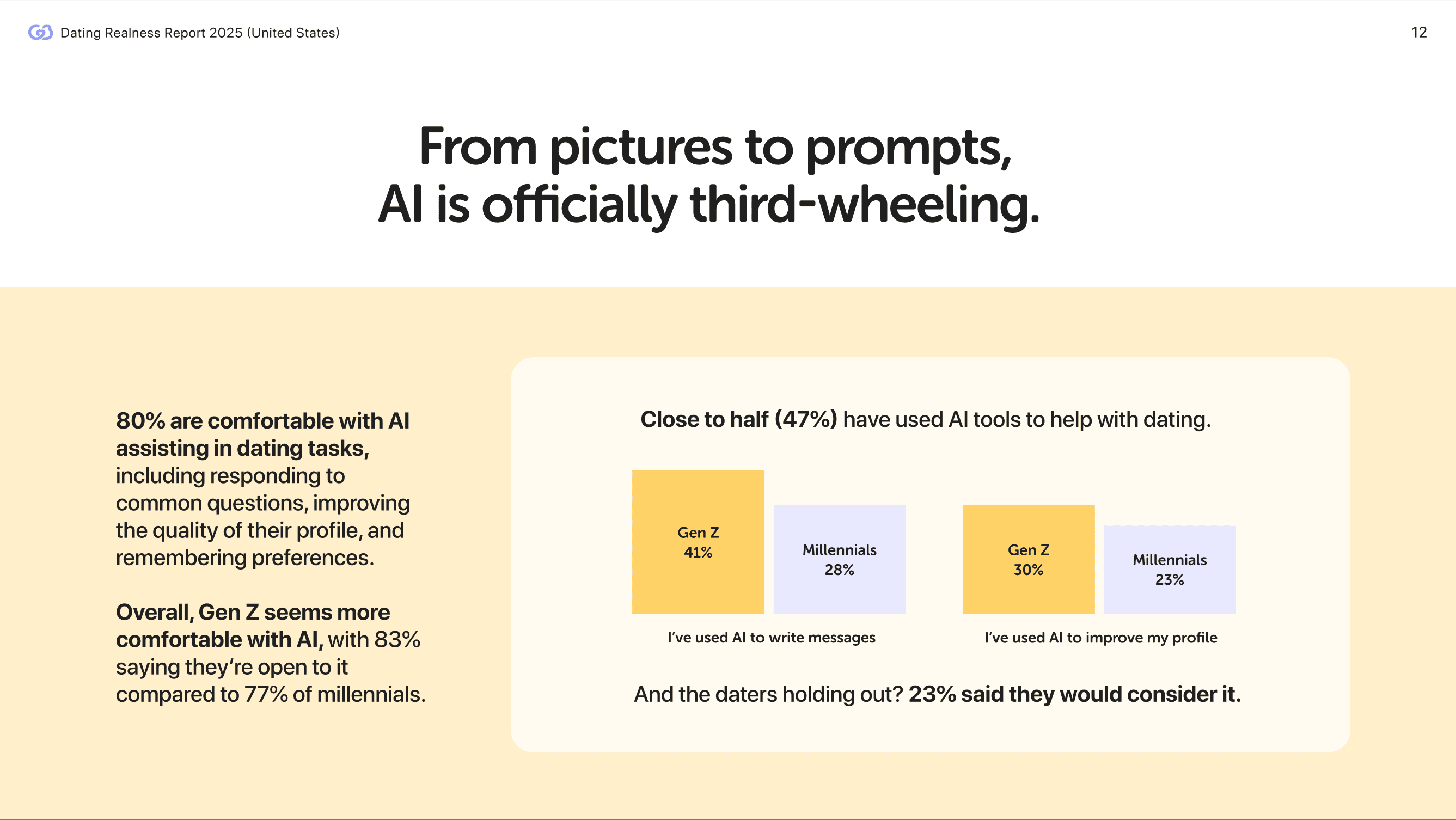 80% are comfortable with AI assisting in dating tasks, including responding to common questions, improving the quality of their profile, and remembering preferences