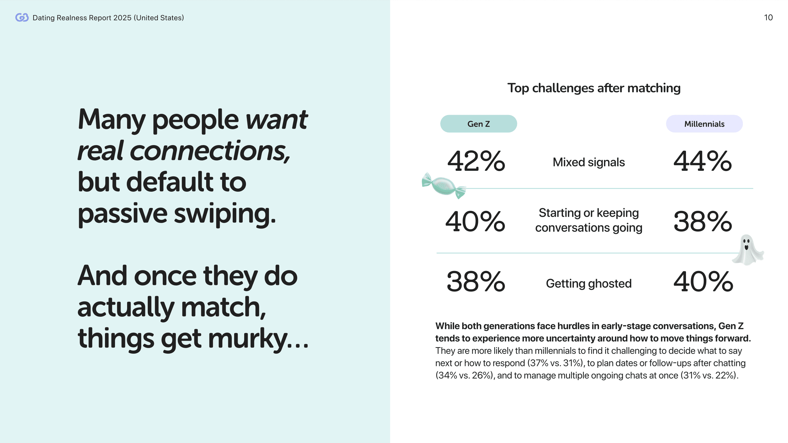 Endless swiping without meaningful matches topped the list of challenges (54%), followed by getting ghosted or unmatched (47%).